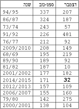 שימו לב לטבלה שפרסמנו בתחילת דצמבר. עם הגשם של שישי-שבת עדיין חסרים לנו 150 מ"מ עד סוף ינואר רק להגיע לממוצע הרב שנתי. נקווה לטוב.